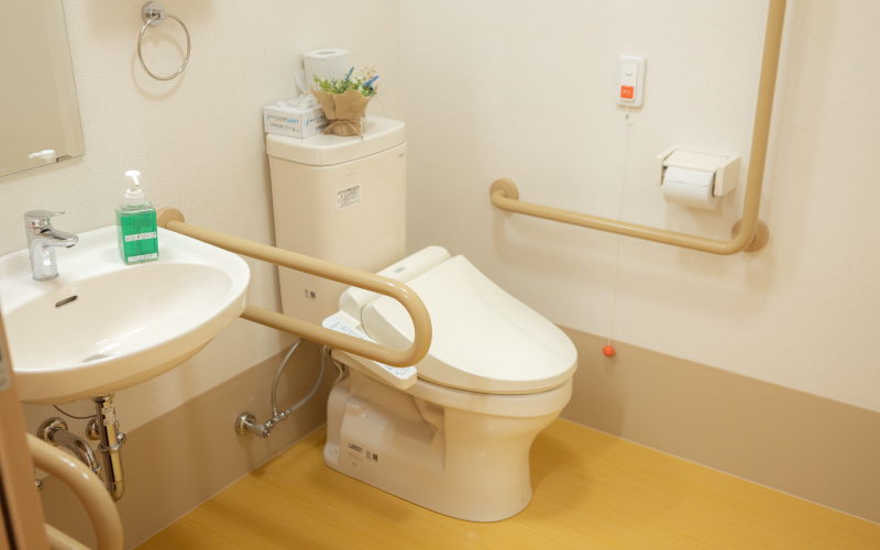 全面バリアフリー設計、居室の玄関扉はスライド式のため車椅子の方でも安全。トイレには温水便座が完備、手すりやスタッフコールがあるので、もしもの時にも安心です。ちょうど良い大きさのキッチンには、IHを備え付け安全にも配慮しています。